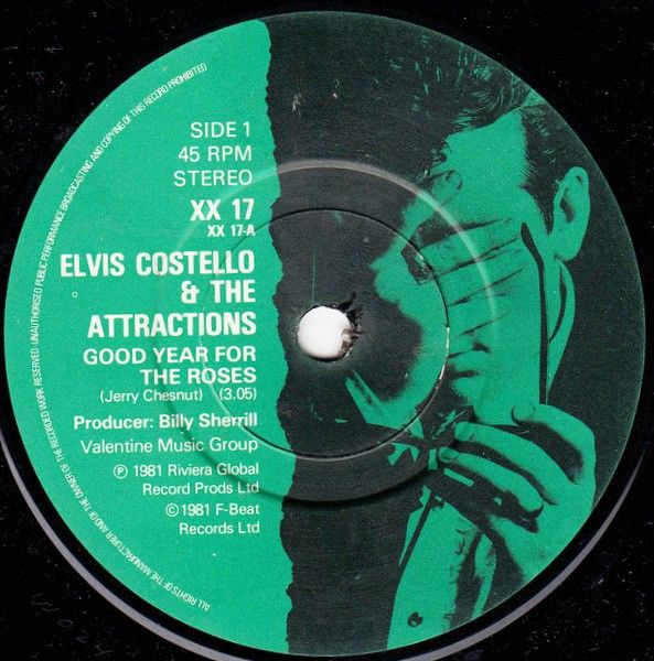 Good Year For The Roses [3:08] 1981-__-__ 7" Columbia 18-02629 US white label promo Artwork. 7" UK F-Beat XX 17 7" USA Columbia 18-02629 Images to follow. Produced by: Elvis Costello Recorded at the Palomino Club, North Hollywood, CA 1979-02-16 Charts. Good Year For The Roses LYRIC clipping #6 (UK)