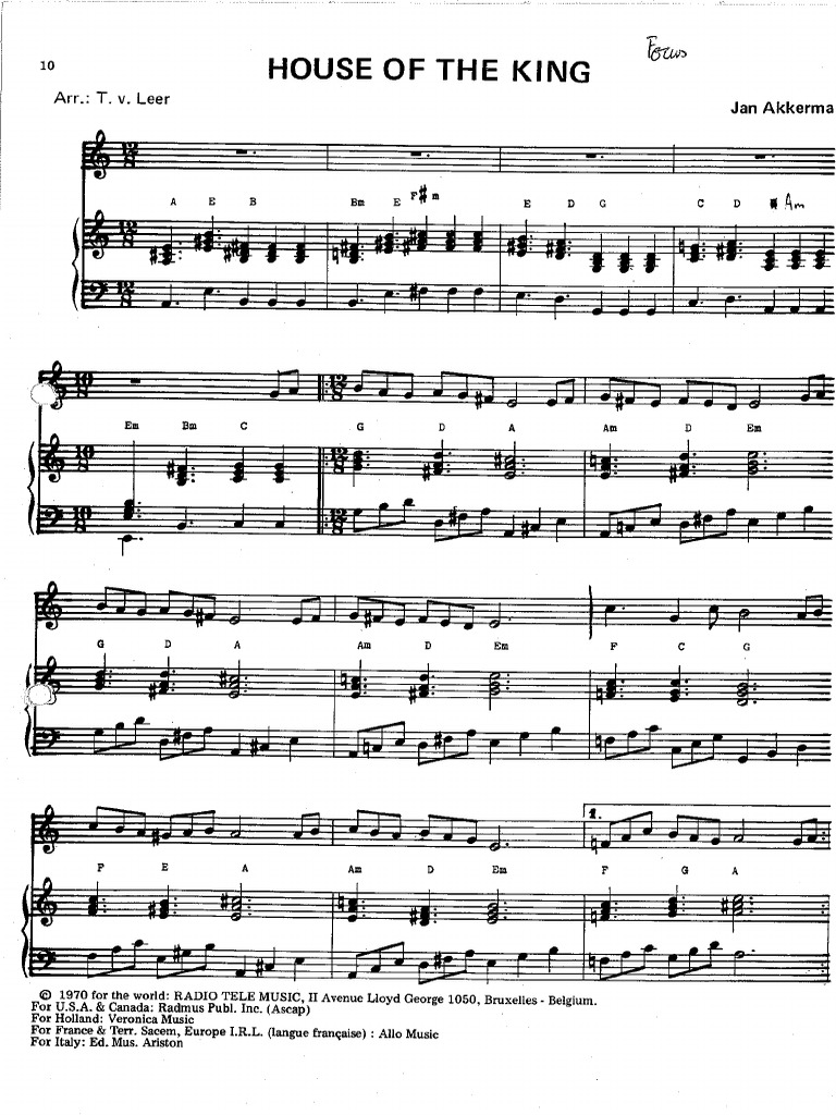 Its the chords for "House of the King" from "Focus 3". Its pretty easy, but its fun to play with two guitars - one on melody (the flute part) and the other on the chords. Any comments or corrections from other focus fans would be great! - Jeff Denton The format is: Intro Verse 2X Bridge Verse (a beat is dropped at the end of some of the phrases.