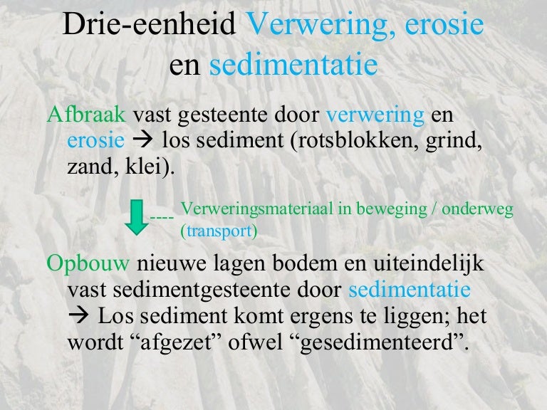 Door krachten die van binnenuit de aarde op het aardoppervlak inwerken ontstaan onder meer gebergten en vulkanen. Dergelijke landschappen veranderen weer onder invloed van krachten die van buitenaf op het aardoppervlak inwerken. Dat gaat in verschillende stappen, waarover meer in deze les. Feit is dat door dit proces van afbraak en opbouw dag.