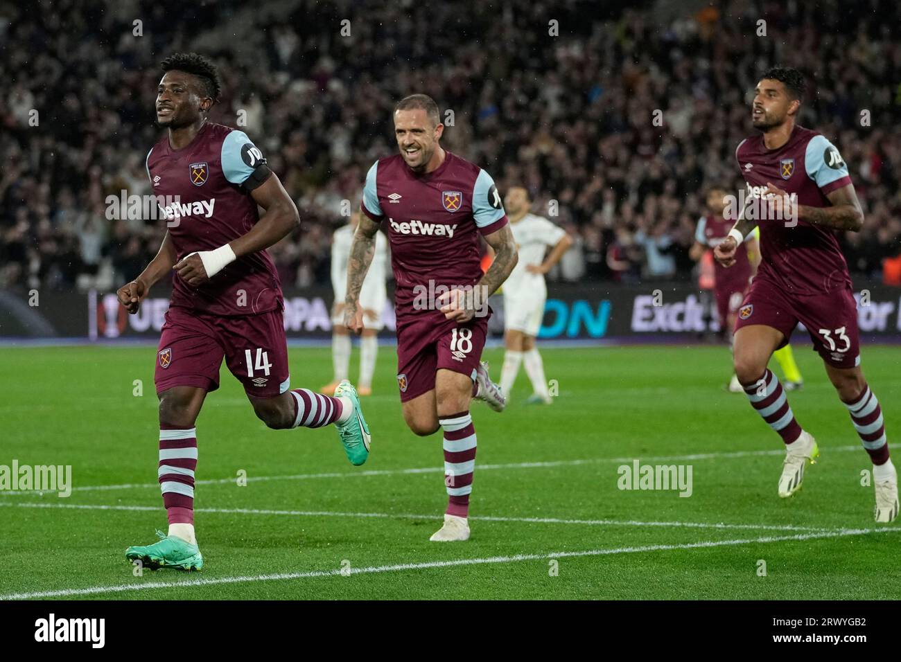 West Ham's Mohammed Kudus, left, celebrates with teammate after scored his side first goal